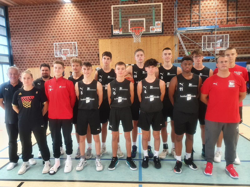 Assistent Alexander Schönhals, BBW Landestrainer Thomas Adelt, Ricards Rocans (BSG Ludwigsburg), Felix Kiehlneker (BBU 01 Ulm), Johann Cardoso Zies (BSG Ludwigsburg), Armin Pivac (BSG Ludwigsburg), Leon Detvernier (USC Heidelberg), Marko Petric (BBU 01 Ulm), Physio Maren Lickert, Jannik Nägele (BSG Ludwigsburg), Daniel Stegmüller (TSG Wiesloch/TSV Wieblingen), Miguel Grau-Rodriguez (USC Heidelberg), Noel Polidori (BSG Ludwigsburg) und Amadou Cisse (BSG Ludwigsburg)