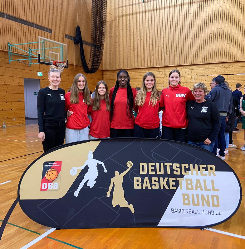 h.R.v.l.n.r.: BBW Landestrainerin Alexandra Maerz, Diana Ivancic (Regioteam Stuttgart), Kira Schakimov (TSV Ettlingen), Sophie Schuster (BSG Ludwigsburg), Paulina Reichenauer (Regioteam Stuttgart), Lucie Zentgraf (BSG Ludwigsburg), Paula Armbrust (BSG Ludwigsburg), Juljana Ehret (USC Freiburg), Assistentin Lea Soltau, Physio Vicky Sautter