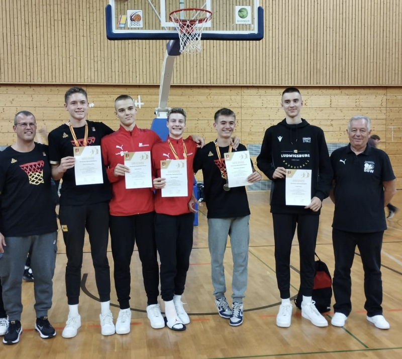 Assistent Alexander Schönhals, BBW Landestrainer Thomas Adelt, Ricards Rocans (BSG Ludwigsburg), Felix Kiehlneker (BBU 01 Ulm), Johann Cardoso Zies (BSG Ludwigsburg), Armin Pivac (BSG Ludwigsburg), Leon Detvernier (USC Heidelberg), Marko Petric (BBU 01 Ulm), Physio Maren Lickert, Jannik Nägele (BSG Ludwigsburg), Daniel Stegmüller (TSG Wiesloch/TSV Wieblingen), Miguel Grau-Rodriguez (USC Heidelberg), Noel Polidori (BSG Ludwigsburg) und Amadou Cisse (BSG Ludwigsburg)