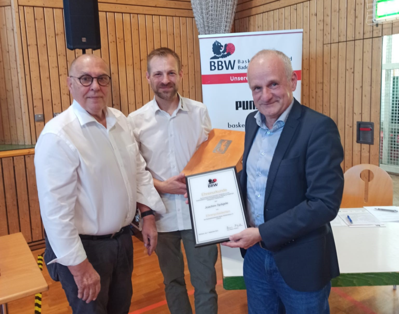 Neben den intensiven, aber stets konstruktiven Diskussionen, darf der ehrenvolle Teil des Verbandstages nicht vergessen werden. So wurde Joachim Spägele, BBW-Präsident von 2009 bis 2022 und bereits vorher seit 1991 als Vizepräsident für Öffentlichkeitsarbeit Mitglied im BBW-Präsidium, zum Ehrenpräsidenten des BBW gewählt. Der 62-Jährige ist seit 2022 Vizepräsident des Deutschen Basketball Bundes und dort für das Ressort Sportorganisation und Sportentwicklung verantwortlich.